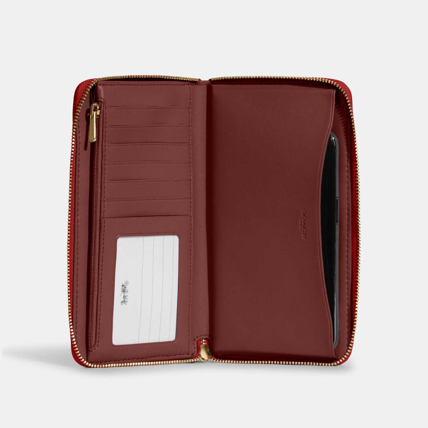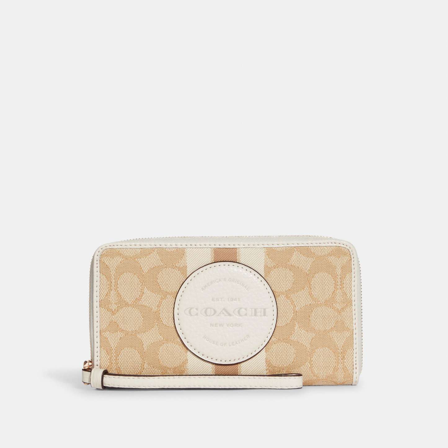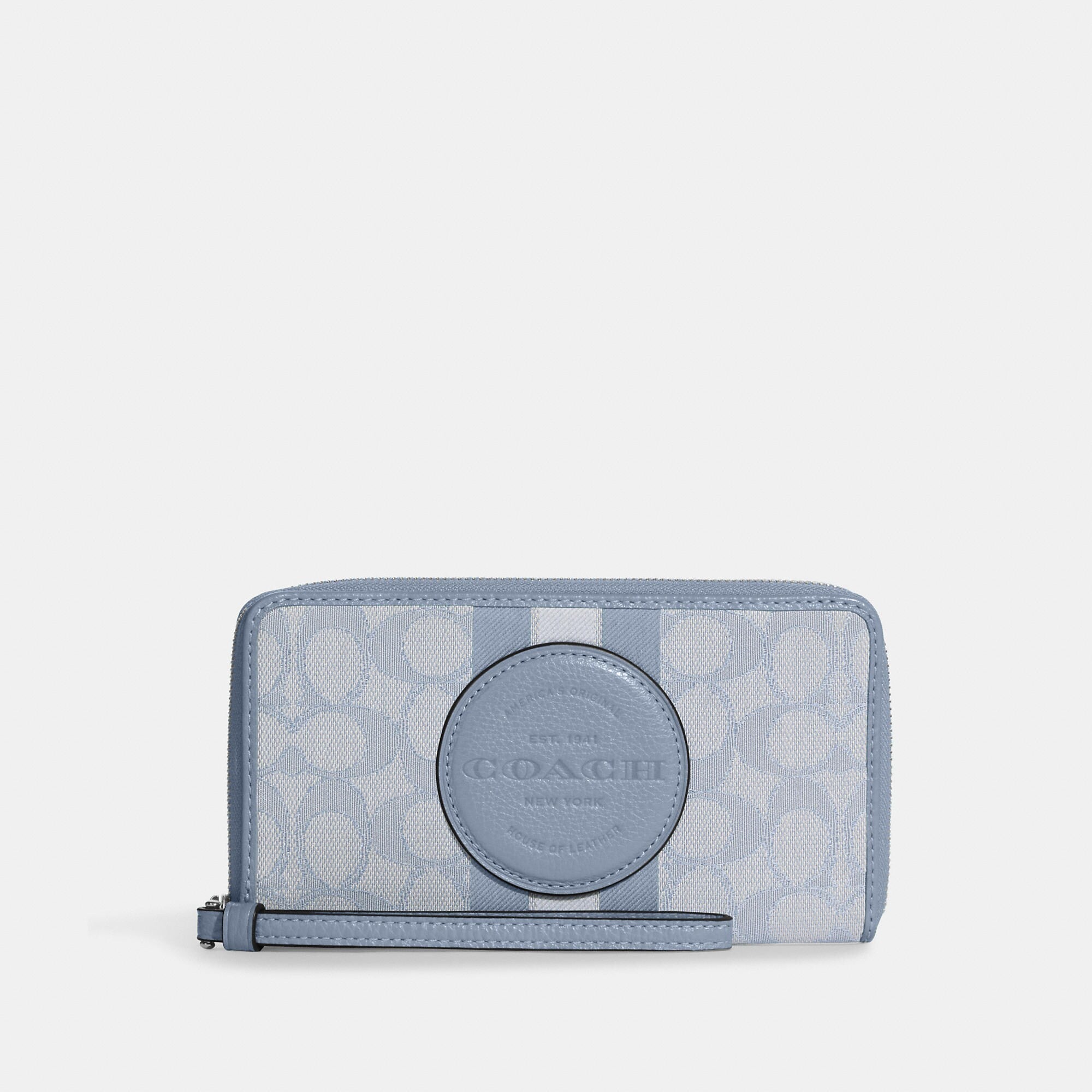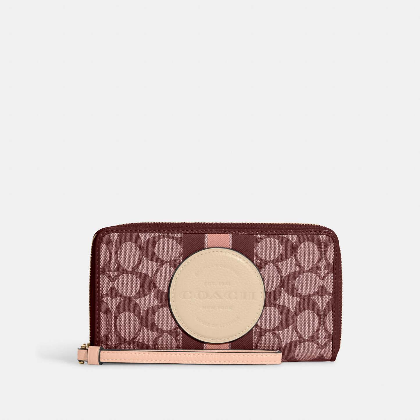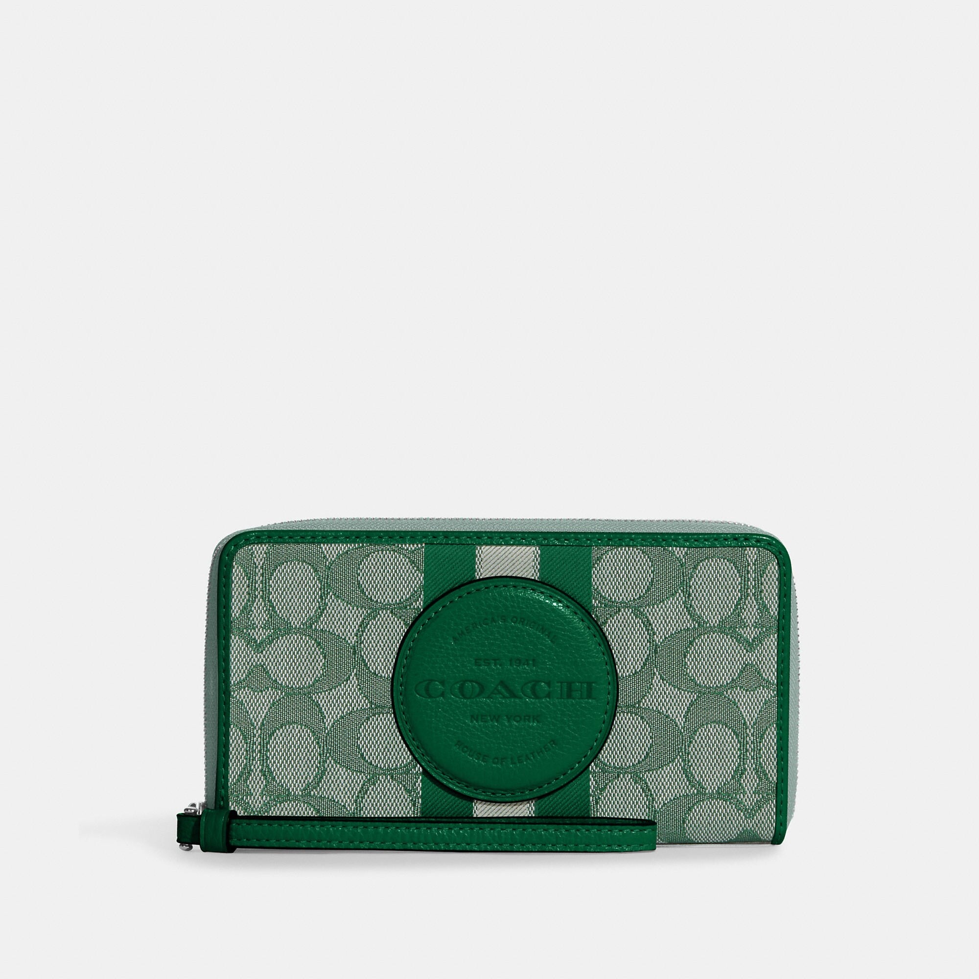 Signature jacquard and refined pebble leather Six credit card slots ID window Zip coin pocket Inside phone pocket Zip-around closure Wrist strap attached 7 1/4 (L) x 4 (H) x 3/4 (W) This piece is crafted with 55% of organic cotton and 45% of polyester yarn recycled from post-consumer plastic water bottles. Wear it love it pass it on. Style No. C9073 | Outlet Dempsey Large Phone Wallet In Signature Jacquard With Stripe And Patch - Red