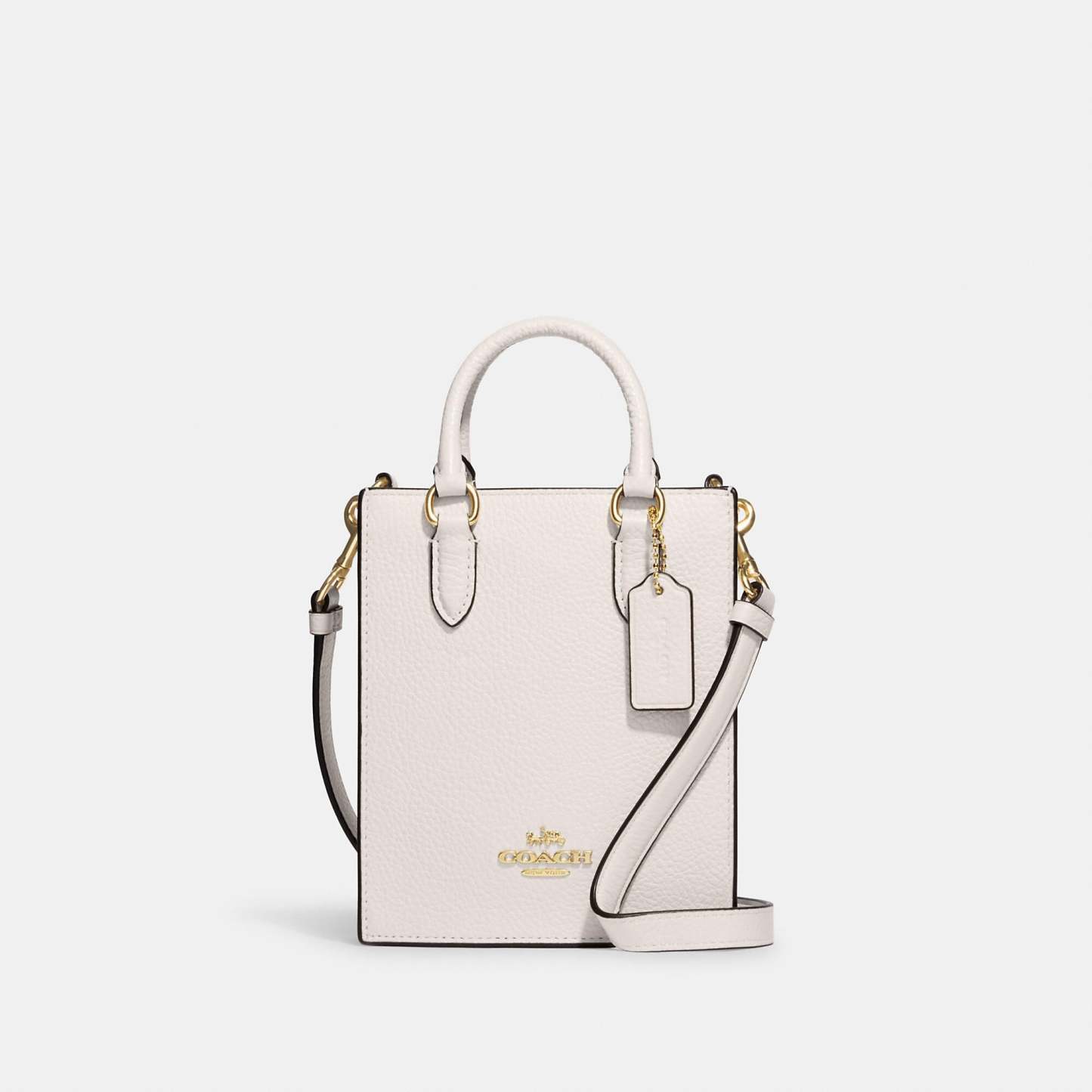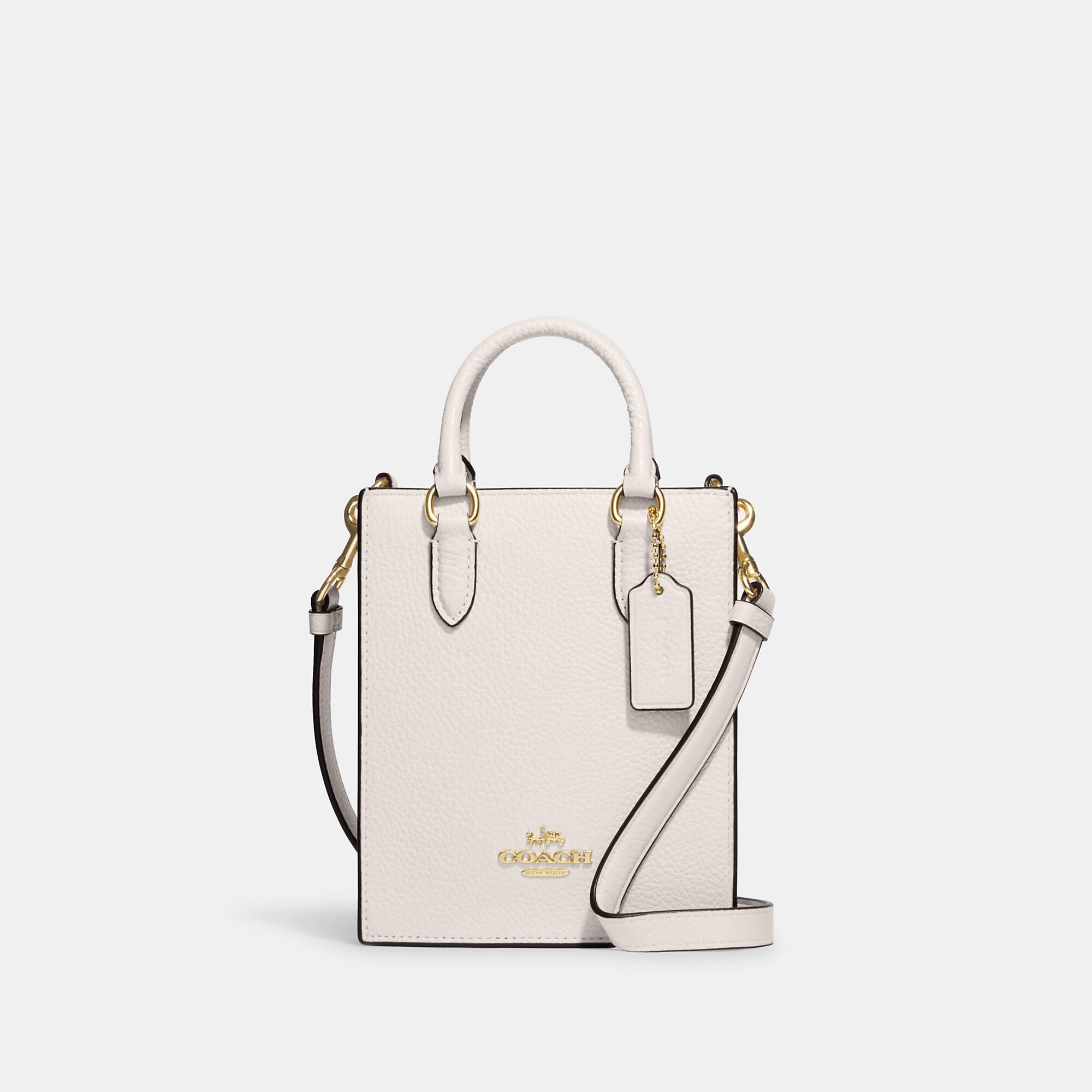 Refined pebble leather Two credit card slots Magnetic snap closure fabric lining Handles with 2 1/4 drop Detachable strap with 23 1/4 drop for shoulder or crossbody wear 5 1/2 (L) x 6 3/4 (H) x 2 (W) Style No. CJ500 | Outlet North South Mini Tote - Gold/Chalk